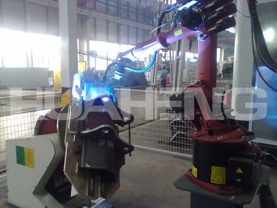 该机械人焊接系统主要用来焊接马达座、导向座、挖齿、挖斗支持座等挖掘机小型结构件